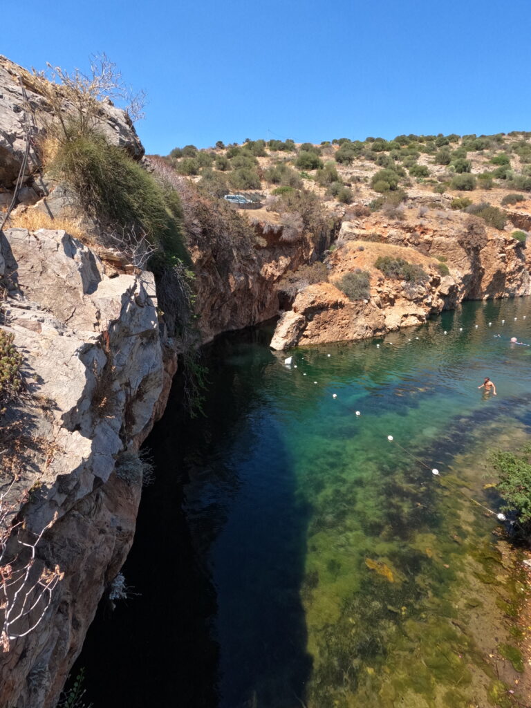 Lake Vouliagmeni is unlike anywhere I’ve been before. Nestled between cliffs, this natural thermal lake feels like a hidden spa. The water is warm year-round, somewhere between 21 and 29°C, and locals swear by its therapeutic qualities. Lake Vouliagmeni is just about a 30–40 minute drive from the city center and can be reached via taxi or even a bus. If you like to save on transportation, I suggest taking the bus. The bus (e.g. 122 from Elliniko, 115, 117 from Glyfada) is less than $2 and will take you directly to Lake Vouliagemi. I suggest arriving there close to opening time, as it can get crowded and once capacity is reached, there will be a waiting time.